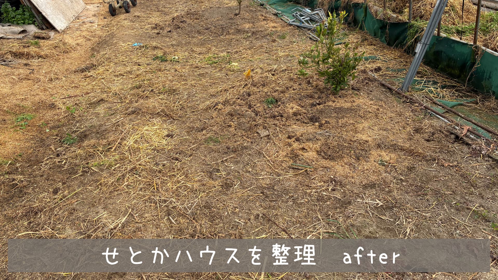 雑草マルチもヘアリーベッチも敷き藁も全てハウス内から出してスッキリしました。それぞれメリットもありましたが隙間から雑草が出てきて思ったような効果が出なかったことや害虫の隠れ場所になっていたことやヘアリーベッチの繁殖力が想像以上でせとかを覆いかけたことなどのデメリットもあり良い勉強になりました。