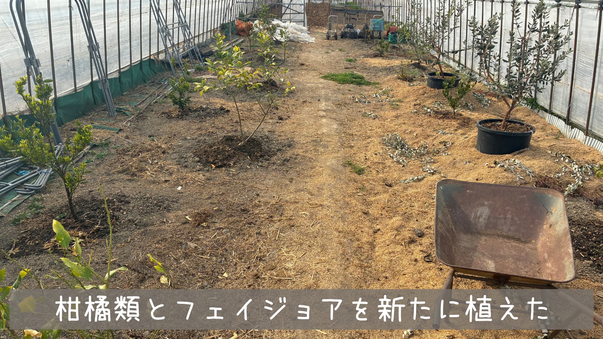 防除の際はシビアになりますがひとまずここで様子見です。ちなみにフェイジョアは鉢のままハウス内に置きました。今後移動する可能性があるためです。せとかハウスでの栽培が長くなれば鉢底から根が出て動かせなくなるため今年中にはどうするか決めていきます。