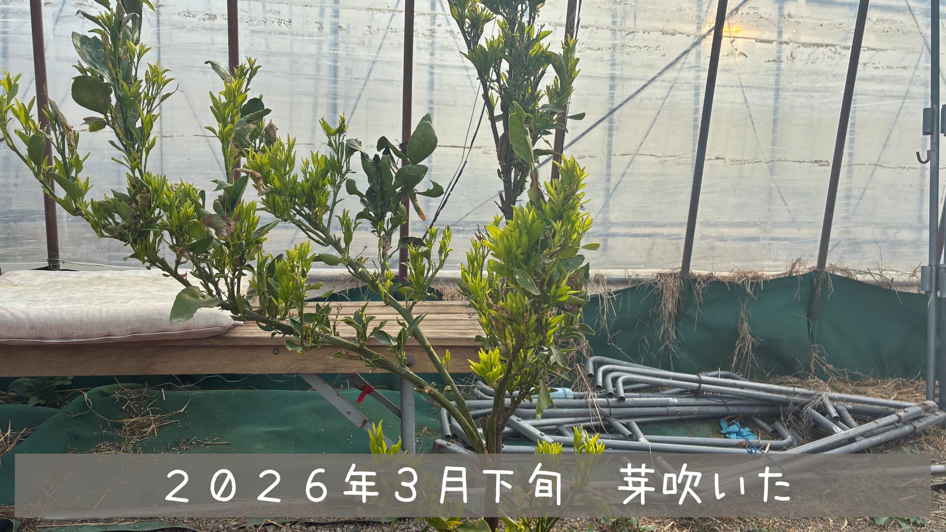 さて時は2026年3月下旬です。日経平均株価の乱高下により一喜一憂している今日この頃ですがハウス内のせとかは新芽が一気に出ました。
