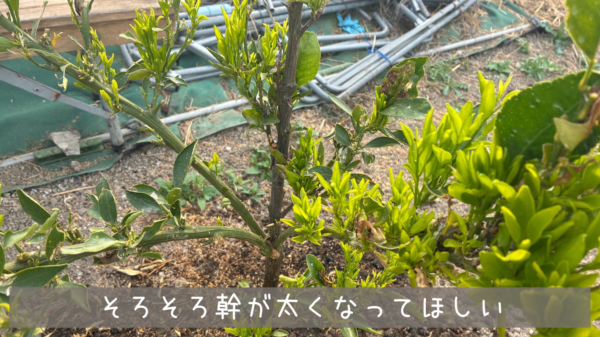 ハウス内はかなり高い気温で昼間は半袖でも汗をかくくらいです。ズタボロだったせとか達もそろそろ幹を太くして枝や葉っぱの量を増やしてほしいです。
