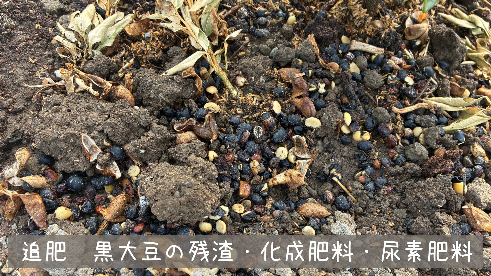 今回は保管していた黒大豆の残渣と少量の化成肥料と農園に余っていた尿素肥料を与えました。黒大豆の残渣に関してはAIに質問して追肥で与えるメリットがあると回答があったため果樹全般に使いました。