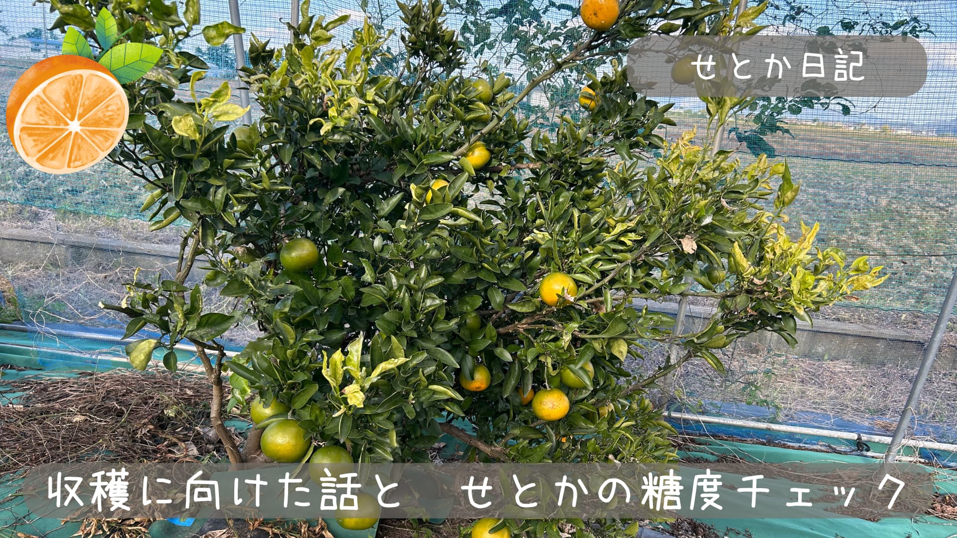 せとかの収穫期としては3月ごろですが12月・1月・2月と毎月せとかの果実を収穫して糖度チェックをしていきたいと思っています。基準となっているせとかの糖度13度付近まで届いたら直売所出荷を検討していきます。
