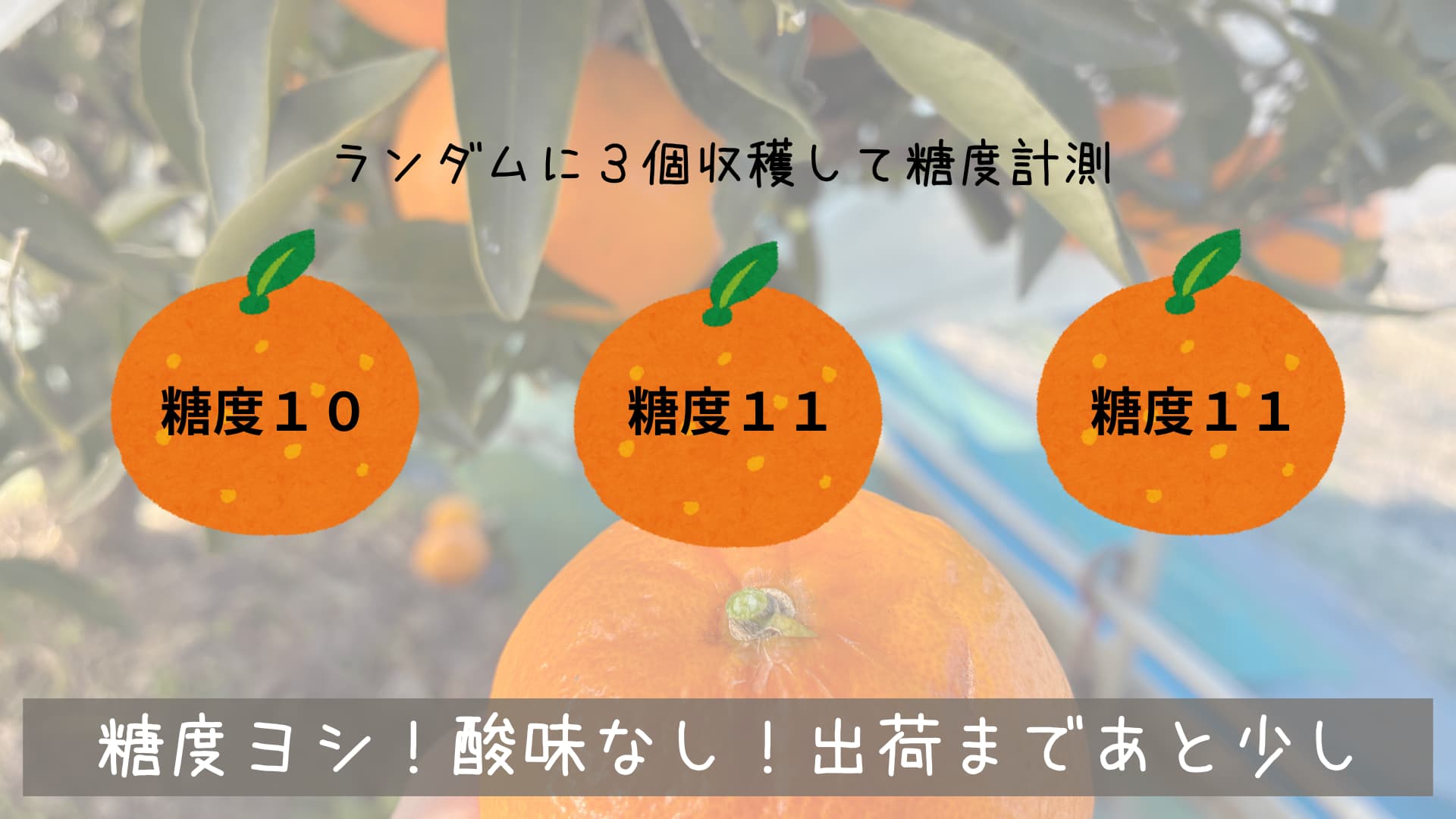 ①樹上で完熟させる:露地なら2月中旬〜3月頃まで樹につけておき、糖度12度以上・酸1%以下くらいまで熟させてから収穫すると味が乗ります。(理想としては糖度13度は欲しいですね)