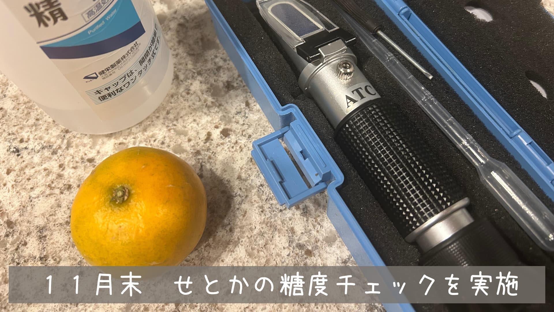 せとか栽培の内容は定期的に記事にまとめて投稿しています。投稿した記事はカテゴリー「せとか日記」にまとめていますので興味があればカテゴリーから記事を選んで読んでみてください。ご近所農家さんからボロボロのせとかの苗木を譲り受けてビニールハウス内に植えた話や摘果果実を使ってジュースにした話、今回のように糖度を調べた話など色々と投稿しています。今は記事が少なめですが今後も記事を投稿していきます。