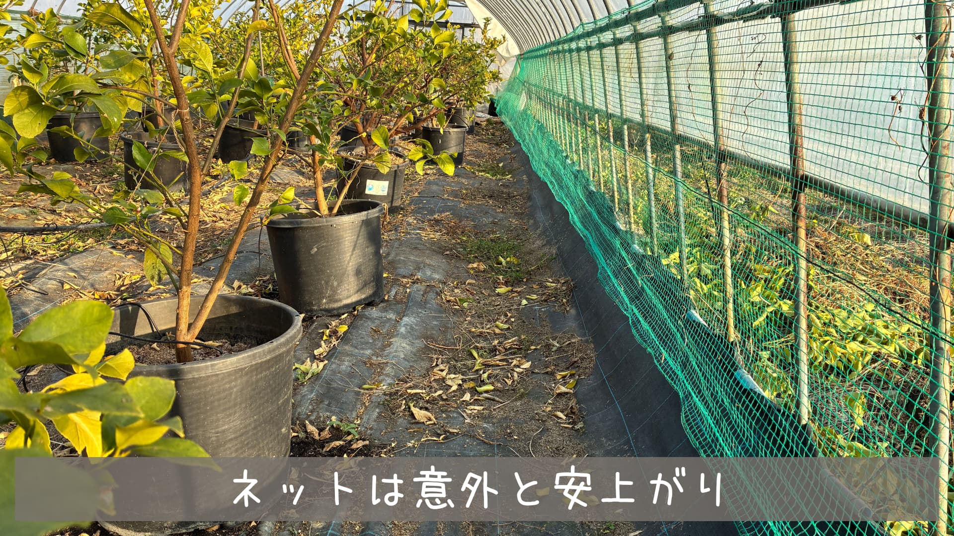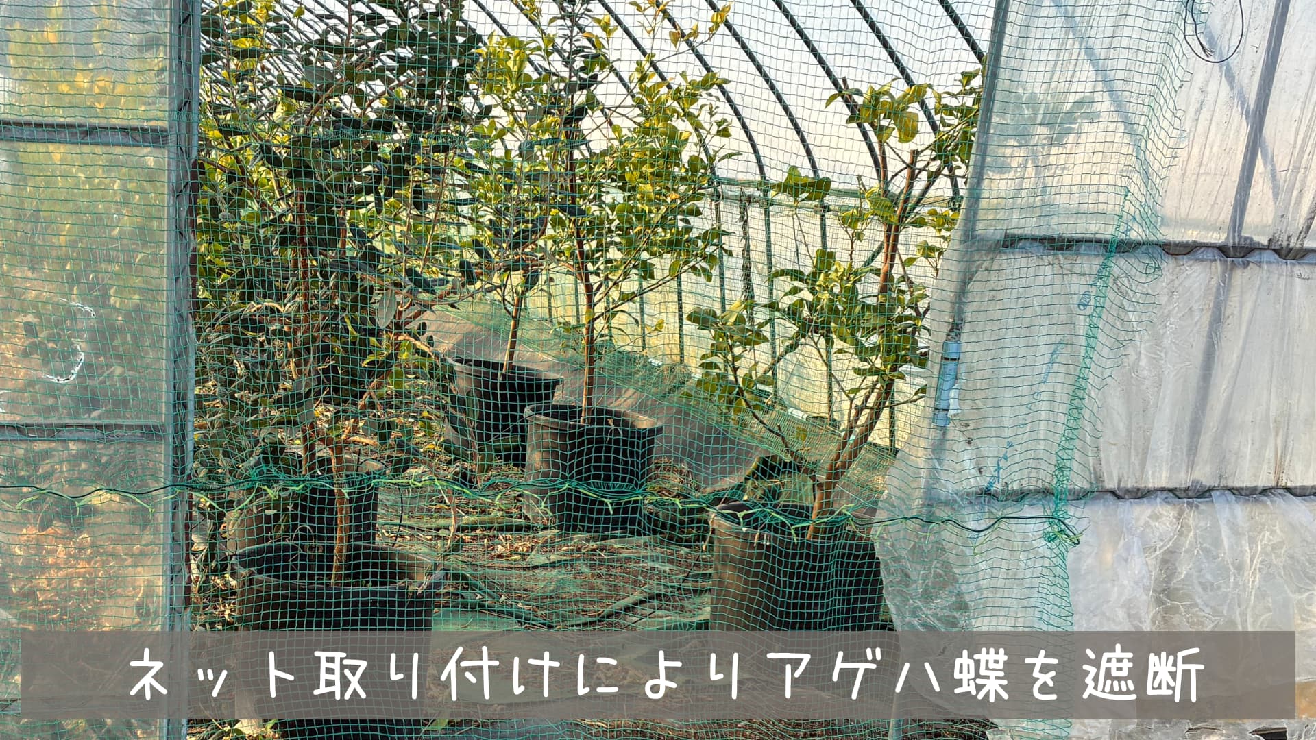 露地で栽培している柑橘類を1本1本ネットで覆うのは大変ですがハウスなら効率的にネットを設置できアゲハ蝶も物理的に侵入できないのでコスパ良く効果を出すことができました。