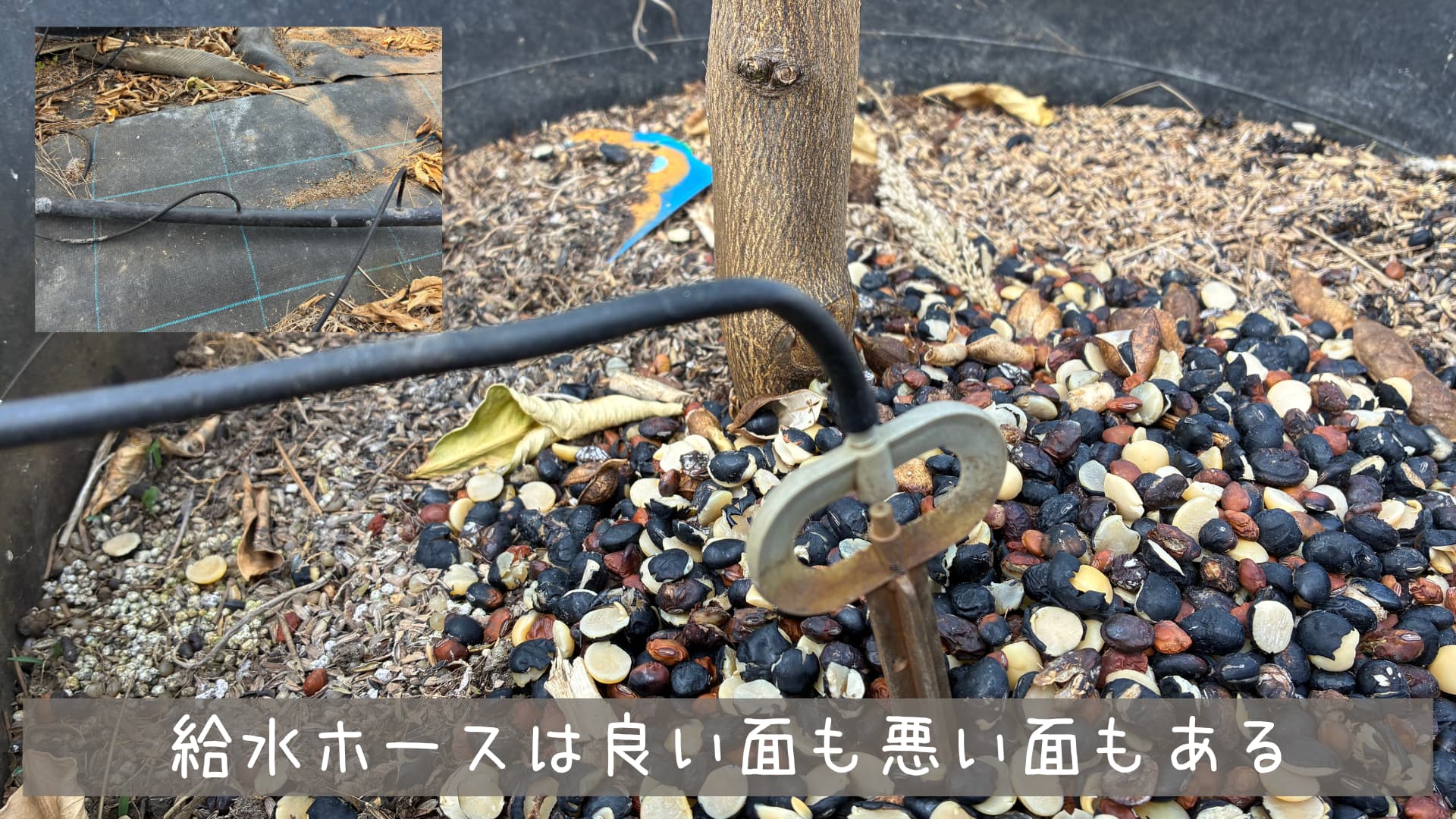 他のデメリットとして「給水ホースの破損」があります。水やりを簡単に行うためビニールハウス内の全ての鉢にホースを繋いでいますが定期的に水の流れを確認しないと大変なことになります。過去にあった事例を出すと、「小動物にホースを噛み切られた」「雑草が給水ホースを移動させた」「小さい虫が給水ペン先で詰まった」「鎌で草刈りしていたら気づかないうちにホースを切っていた」などがあり、数本の果樹は給水できずに枯れてしまったことがあります。給水ホースは便利ですが注意した方がいい部分もあります。