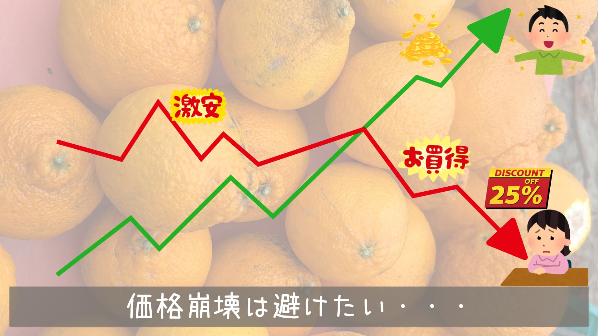 そして売り場に特定の柑橘が増えた結果、需要と供給のバランスが崩れて価格崩壊に繋がっていくことが多いです。生産者Aはみかん1袋200円で出荷し、生産者Bは190円で出荷し、生産者Cは180円で出荷し・・・それでも売り場に供給が続くと、腐らせるくらいなら150円でもいい140円でもいいとなっていき売り場に爆安袋が溢れていきます。